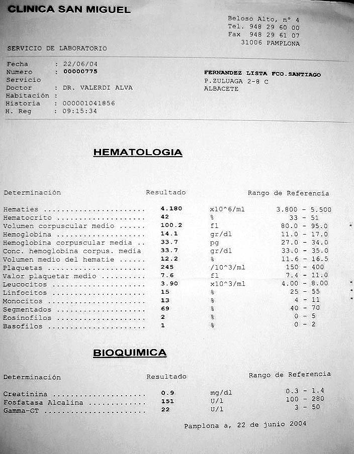 Debido a este problema decidí buscar un oncólogo y un maxilofacial en Madrid y me aconsejaron ( Dr. José Manuel Colmenero) que visitara al Dr. en Oncológica D. Gumersindo Pérez Mangas el cual tras explorarme, ( el 28 de Sept. 2004 ) me dio cita para Diciembre con unos análisis y un TAC (Dijo que me veía muy bien). El mismo día me vio el Dr. en Maxilofacial Julio Acero quien me extrajo la muela inferior y me puso un punto, mandándome cita con una radiografía para el 11 de Octubre 2004.